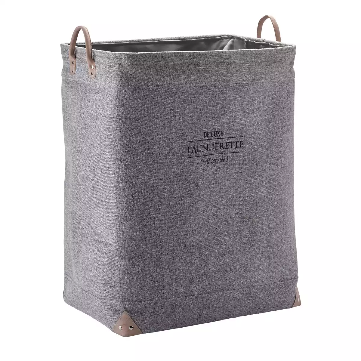 Elegant tvättkorg i tyg med läderhandtag och hörn