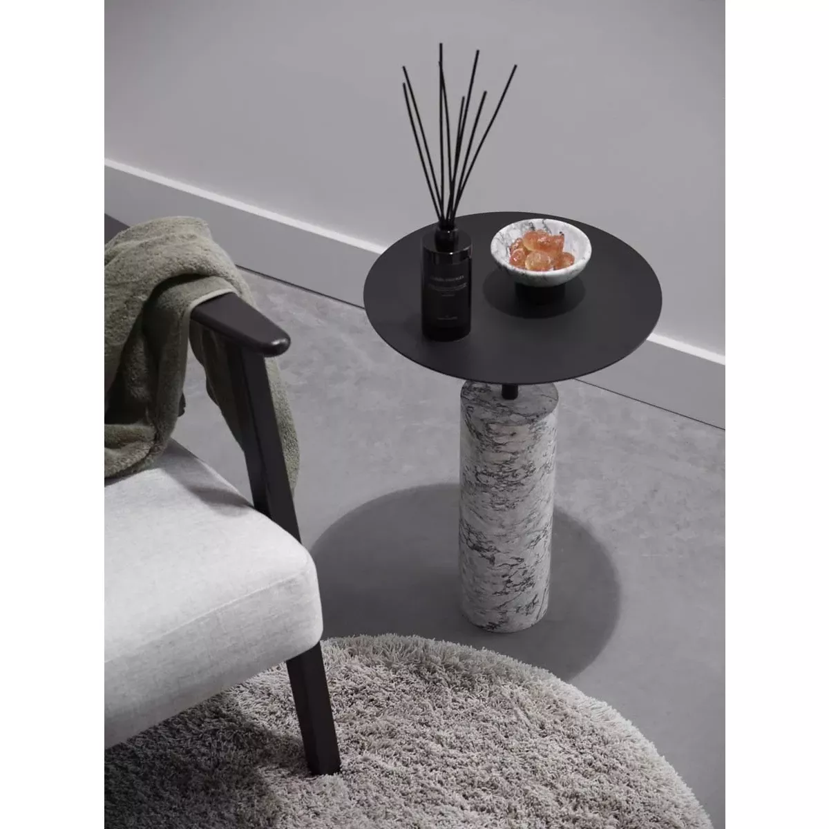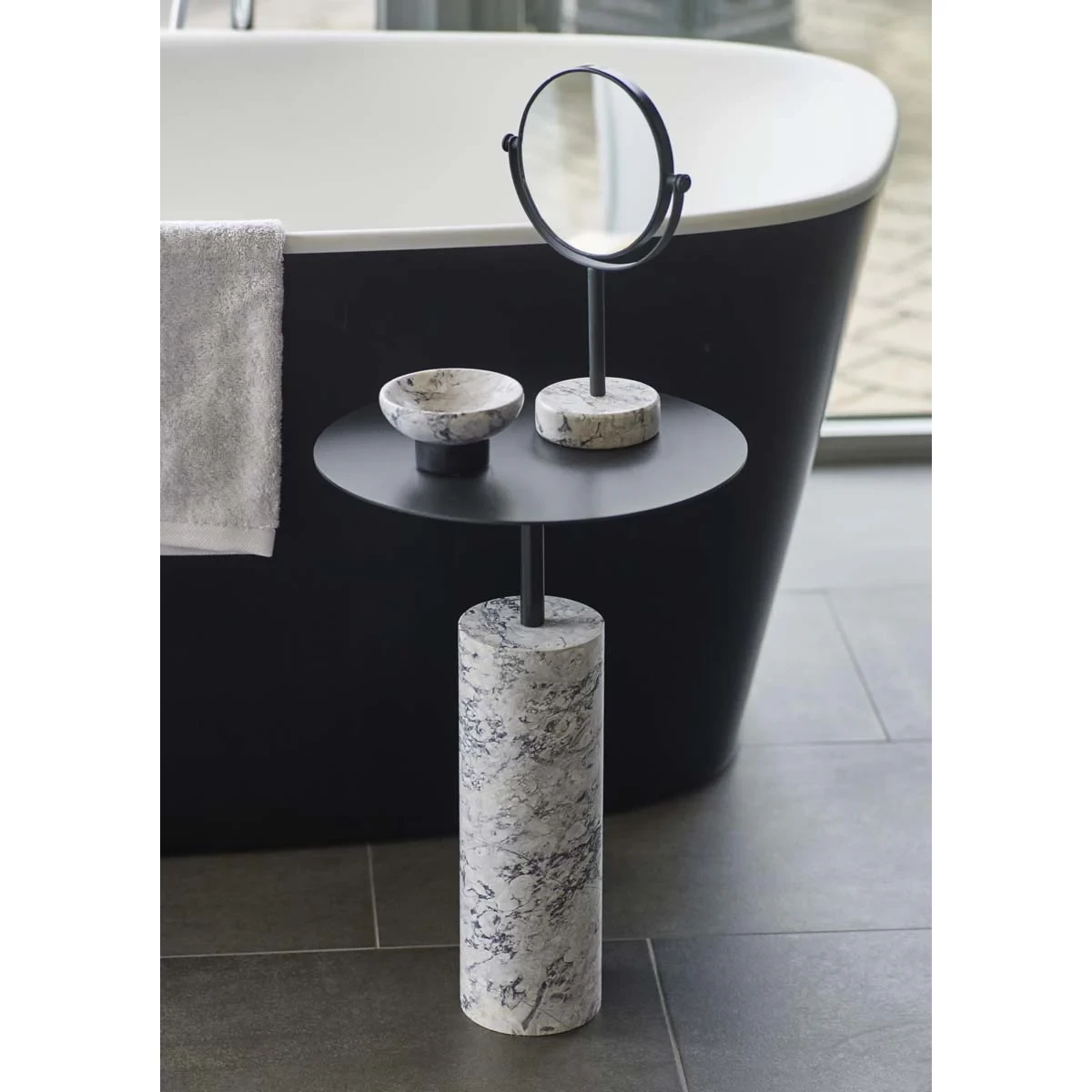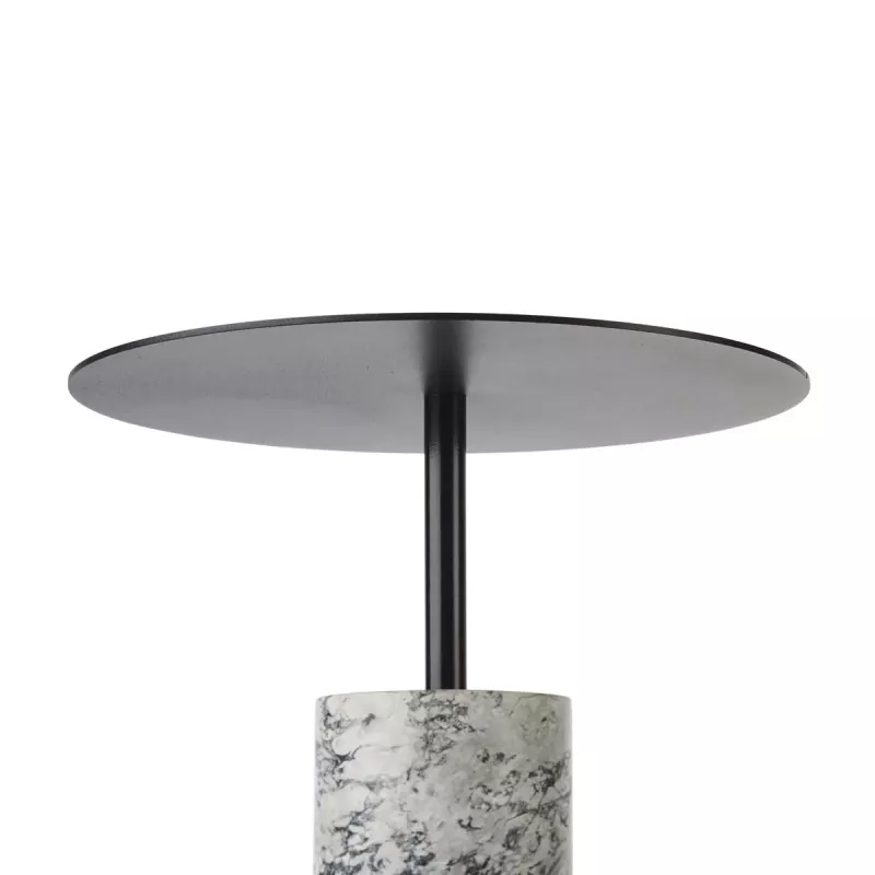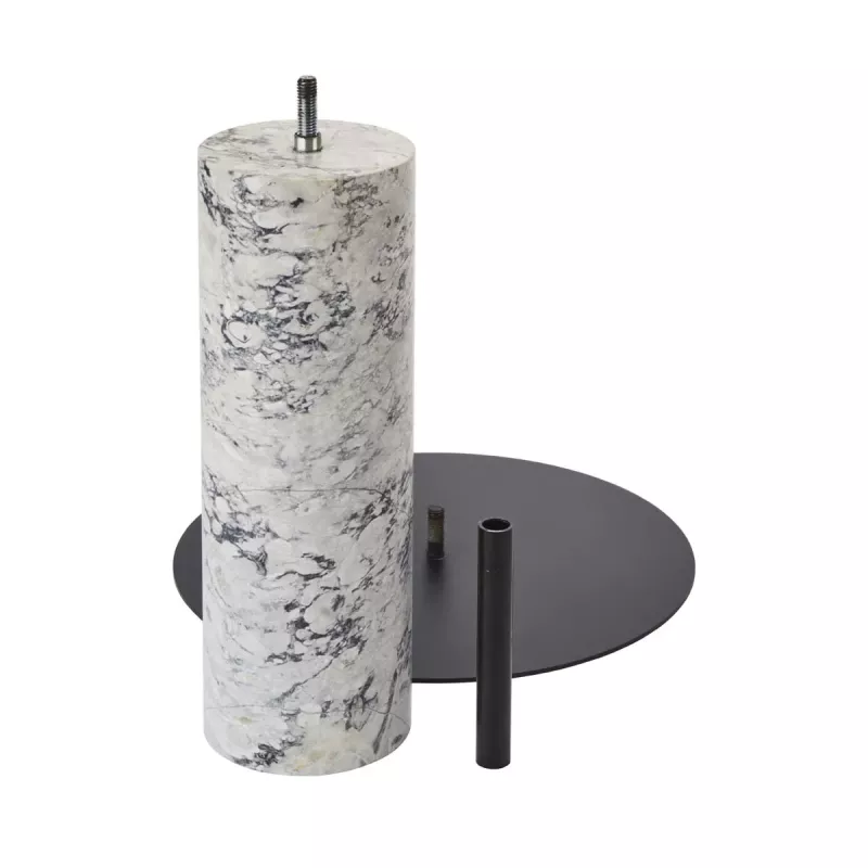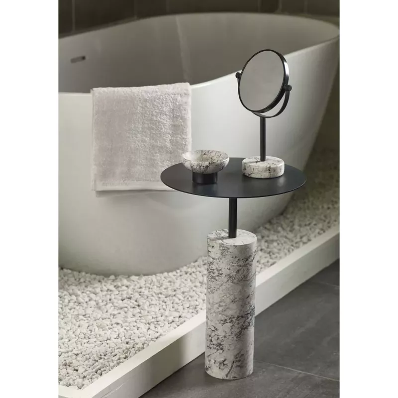 Den robusta foten i natursten ger stabilitet och ett lyxigt intryck, medan den svarta stålskivan tillför en modern kontrast. Med sina mått – diameter 35 cm och höjd 50 cm – är Nero Alba både praktiskt och dekorativt, idealiskt för badrum, vardagsrum eller sovrum.