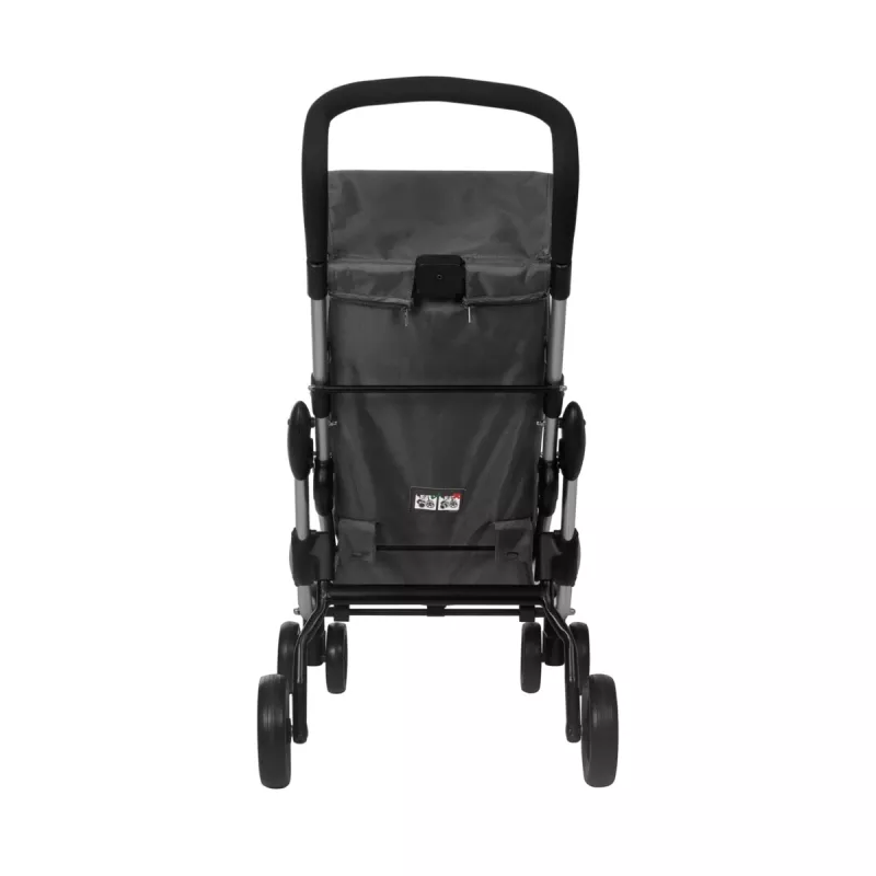 Vagnen har en tvådelad tygväska, där det övre facket är lättåtkomligt utan att du behöver böja dig. Det nedre facket är tillgängligt via en dragkedja, vilket ger enkel åtkomst till hela vagnens kapacitet på 39,5 liter. Den avtagbara väskan gör det också smidigt att lasta i och ur varorna hemma.