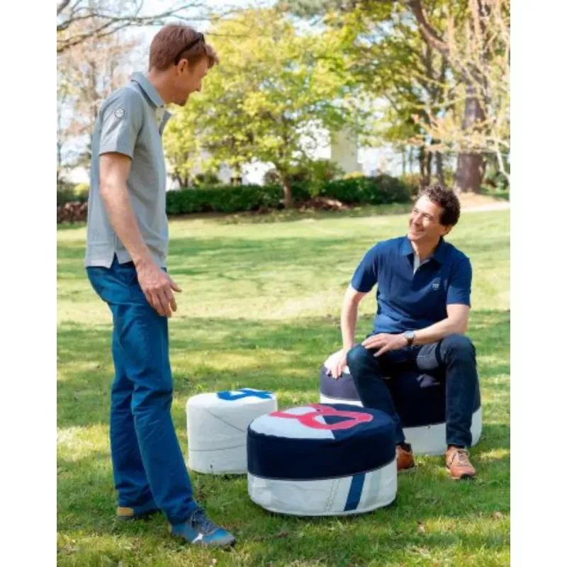 Solo Sittpuff ⌀54 cm - marinblå & röd av segelduk från 727 Sailbags är en exklusiv sittmöbel tillverkad av 100 % återvunnet segel, insamlat och återbrukat i Frankrike. Varje produkt bär spår av sitt tidigare liv till sjöss – ett material som varit utsatt för vind, salt och sol, vilket ger en genuin maritim karaktär och gör varje exemplar unikt. Den robusta segelduken i dacron eller spinnaker är extremt slitstark, UV-beständig och framtagen för att klara tuffa marina förhållanden, något som uppskattas av seglare och båtentusiaster.