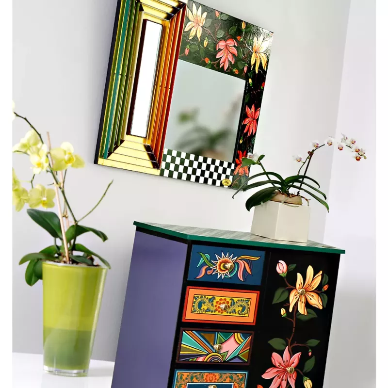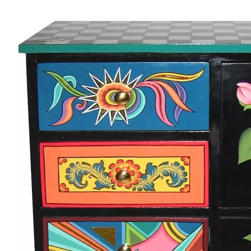 Med Drawer Chest Bora Bora (Black) får du en möbel som inte bara är praktisk utan också en konstnärlig mittpunkt i din inredning. Den svarta basen och färgglada accenterna gör den till en mångsidig möbel som passar i många olika typer av inredningsstilar.