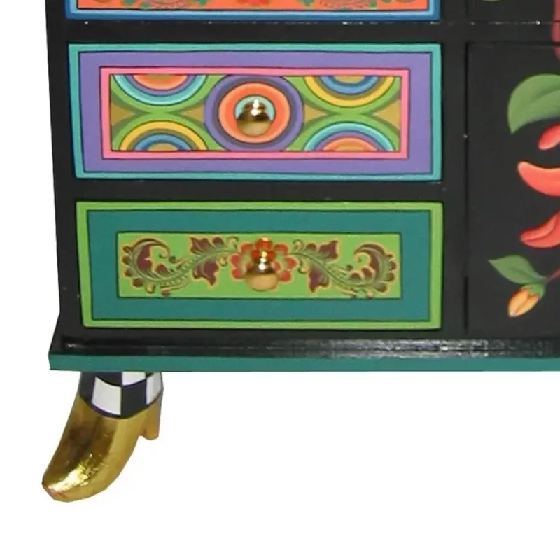 Upptäck Drawer Chest Bora Bora (Black), en handgjord byrå från Toms Drag som kombinerar modern stil med färgstark kreativitet. Med sin eleganta svarta bas, livfulla detaljer och praktiska förvaringslösningar är denna möbel perfekt för dig som söker något unikt och funktionellt till ditt hem.