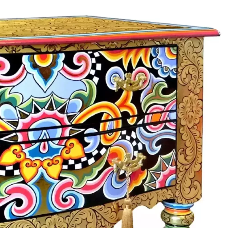 Färgsprakande design: Handmålad med levande färger, djärva mönster och gulddetaljer som ger byrån en exklusiv och sofistikerad känsla.
