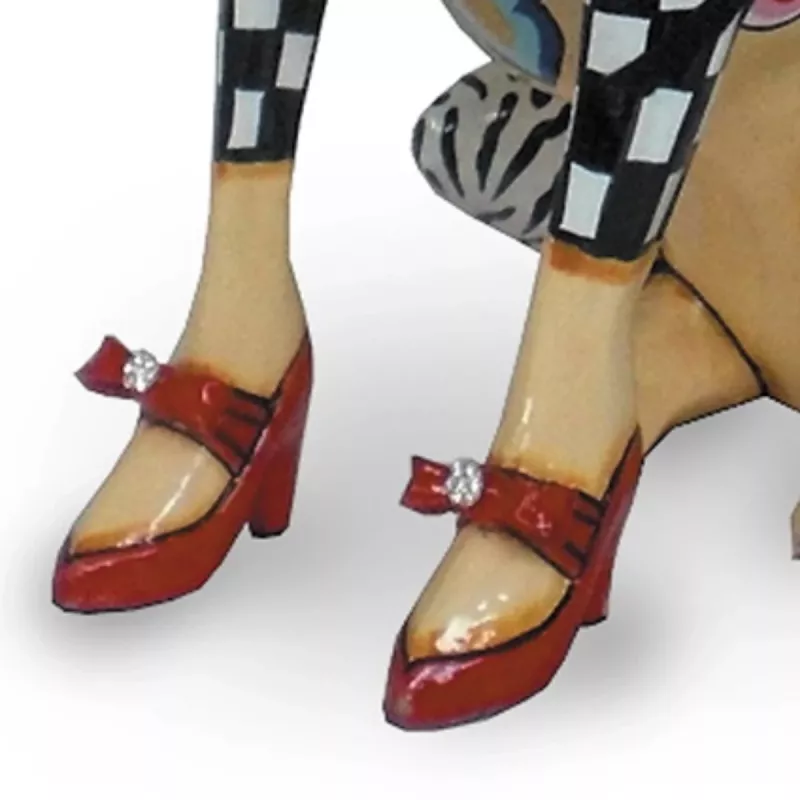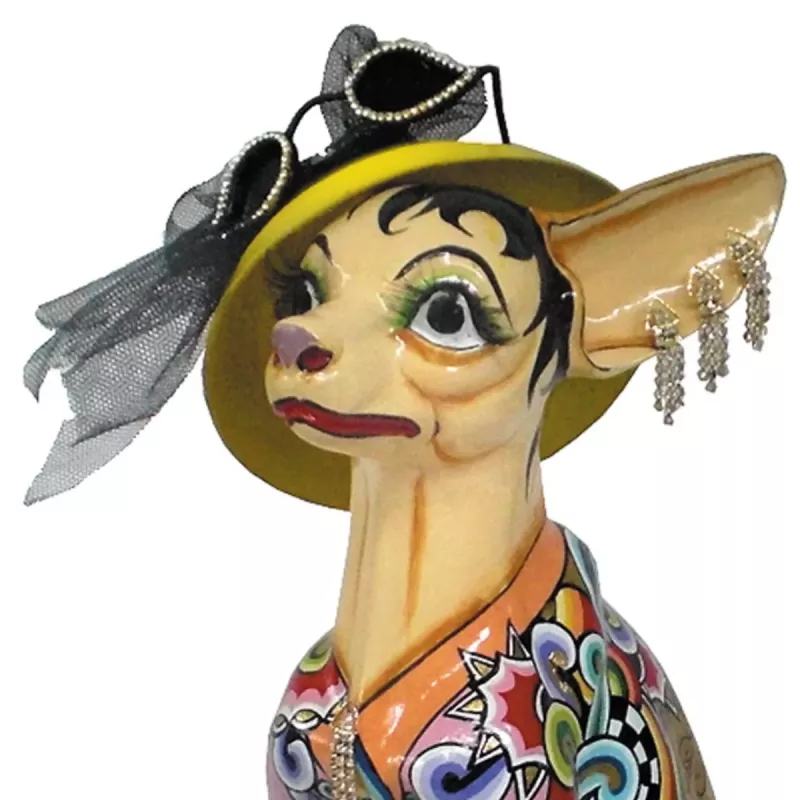 En Glamourös & Lekfull Konstfigur - Vill du addera en charmig och färgstark inredningsdetalj till ditt hem? Toms Drag Chihuahua Sittande Frida L 4076 är en handgjord och handmålad skulptur som utstrålar personlighet, elegans och humor. Med sina långa ögonfransar, glittrande strassörhängen, röda pumps och en avtagbar hatt, är denna sittande Chihuahua en ikonisk och stilfull dekoration för hundälskare och konstentusiaster.