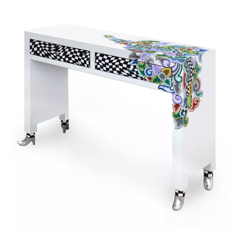 Elegant och Handgjort Bord i Modern Design - Letar du efter ett stilfullt och unikt konsolbord som kombinerar modern design med konstnärliga detaljer? Toms Drag Konsolbord Silver Line 102167 är en exklusiv möbel som utstrålar elegans och kreativitet. Med sina silverfärgade skor och handmålade detaljer blir detta bord en perfekt inredningsdetalj för ett modernt hem.